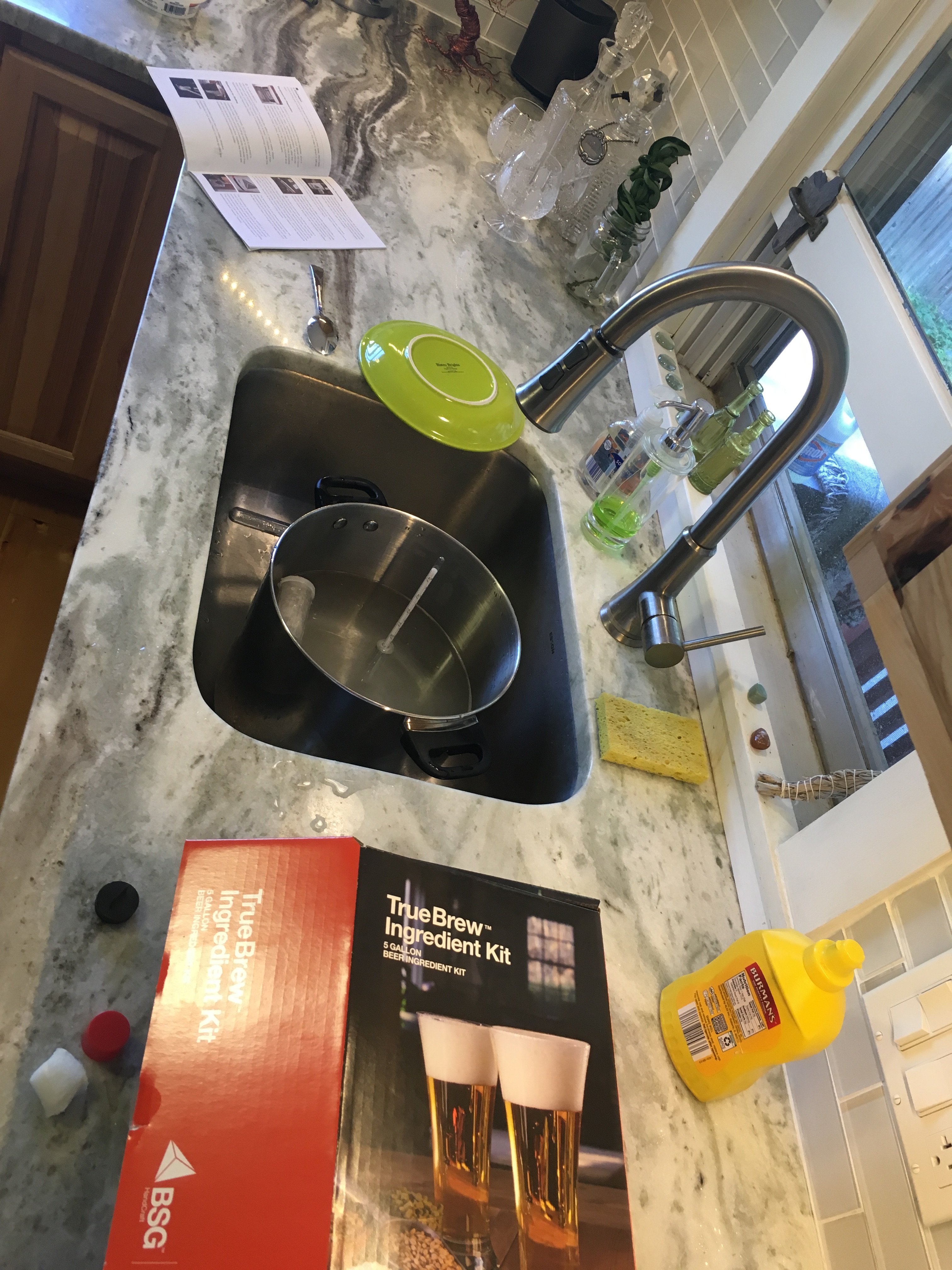 Once I giddily unpacked everything and read through the instructions (Captain DIY is a fan of reading instructions, especially if you want your project look anywhere near what it’s supposed to), it was time to start sanitizing. I mixed a bit of sanitizing cleaner and warm water in a large pot and let everything soak for about 15 minutes. After the main boiling pot had been thoroughly cleaned and sanitized, I put about two gallons of water in and put it on the stove. Then I sat down and read a book while I waited for my electric stove to boil two gallons of cold water.