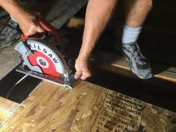 Since I started with the center sheet, I will lay the next one down on one side of it, making sure the end seams are at least two joists apart. Same procedure here, now that we have all of the tricks down it should be a breeze. A difficult, sweaty, curse-inducing breeze. As long as we stagger the seams